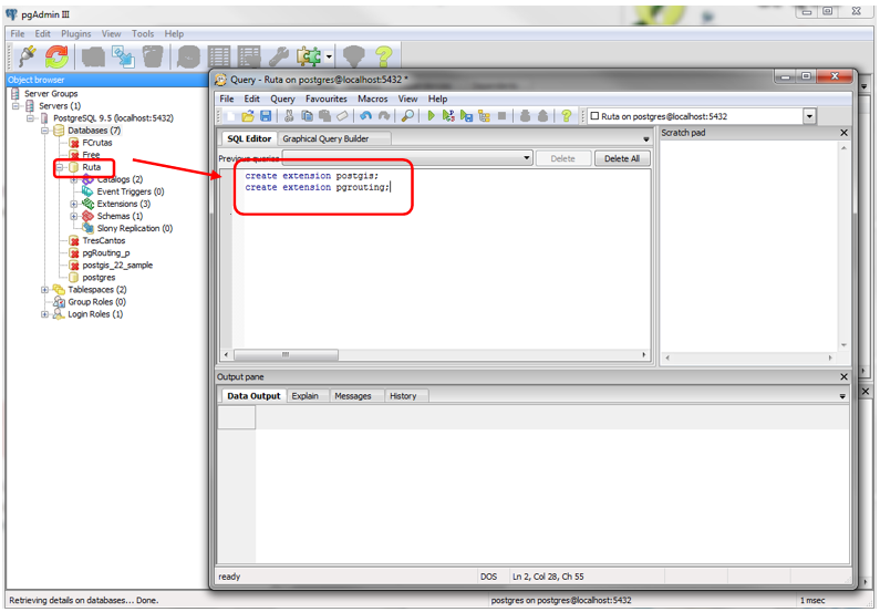 Para ello, con una base de datos alojada en Postgres creamos las dos extensiones con el siguiente comando en la ventana del creador de consulta SQL de pgAdmin III de Postgres: