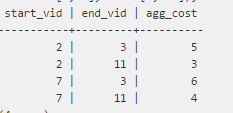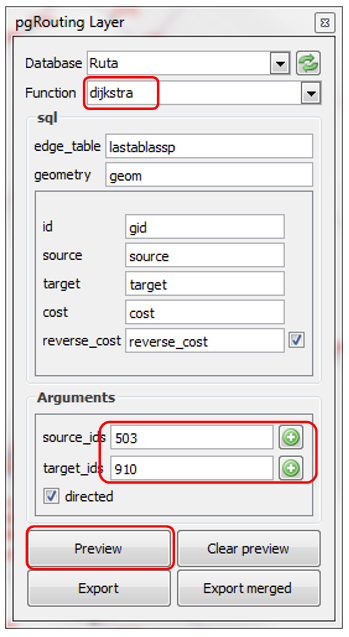 Para ello seleccionamos el algoritmo, el nodo inicial («source_id») y el nodo final («target_id») y pulamos en «Preview».