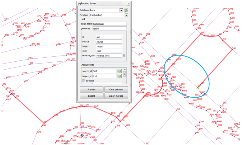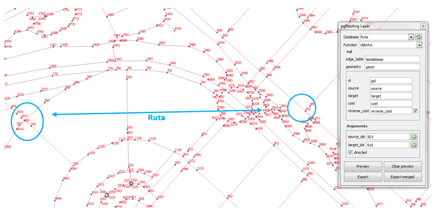 Con la conexión establecida cargamos la capa y activamos el panel de pgRouting Layer, y vamos a realizar la ruta entre el nodo 503 y el 910 con el algoritmo Dijsktra.