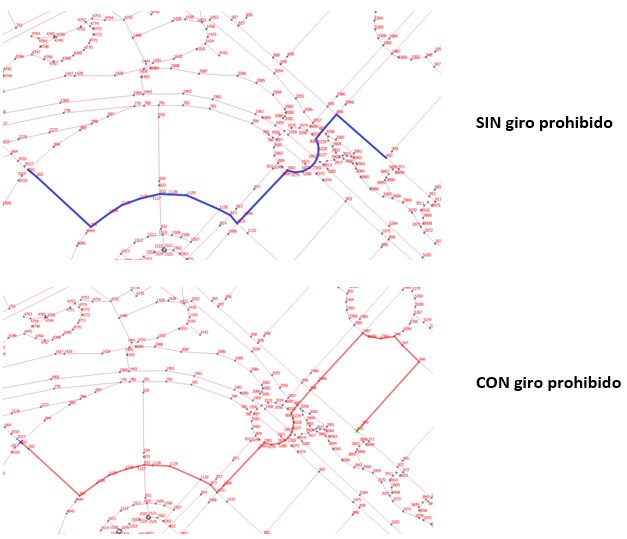 Para ello se utiliza una tabla de giros y se puede usar el algoritmo «trsp (vertex)» en donde se determina el arco y el nodo por el que no se puede pasar. Al resolver el análisis se obtiene una ruta diferente.