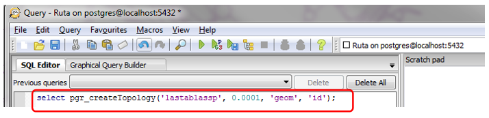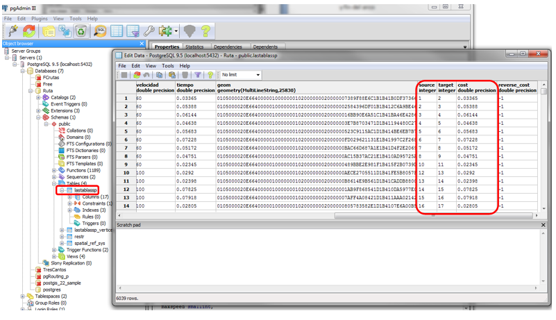 En análisis de redes siempre se realiza de un nodo inicial a uno final pasando por un arco, con lo cual es necesario que la capa del grafo tenga ese nodo inicial y final y contar con esa capa de nodos. Para ello se utiliza un comando de pgRouting que nos da esos nodos utilizando la geometría de la capa (obtenida gracias a la extensión PostGIS) y el id de los nodos, «pgr_createTopology«, siempre se deberá contar con un atributo en la capa de nodo inicial («source») y nodo final («target»):