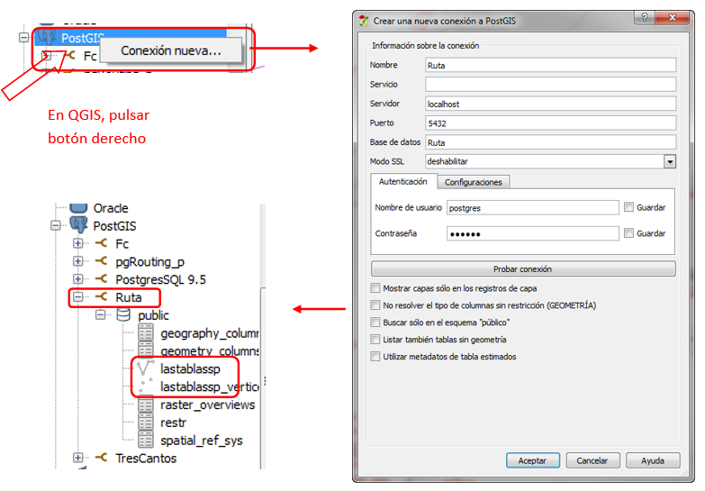 Al hacer la conexión de la base de datos de PostGIS a QGIS se piden las credenciales (usuario y contraseña). En ese formulario se deben activar los check de «guardar credenciales» (para el usuario y la contraseña).