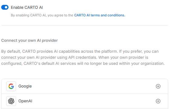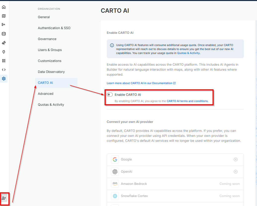 En Carto también han implantado la Inteligencia Artificial (IA) en su plataforma, para activarla (una vez te hayas logueado en su plataforma) debemos dirigirnos al icono de “Invite Users”, posteriormente al apartado denominado “Carto AI” y en este bloque podemos activar la IA en Carto: