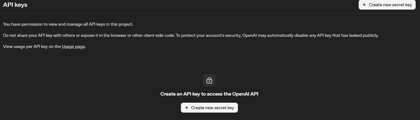 Así si se elige OpenAI, nos logueamos y creamos la API Key.