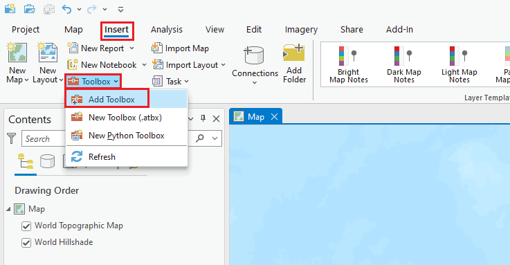 Después abrimos y creamos un nuevo proyecto en ArcGIS Pro. Ya en el software, nos dirigimos al menú superior y seccionamos Insert>Toolboox>Add Toolbox y ubicamos la caja de herramientas que acabamos de descargar descargamos.