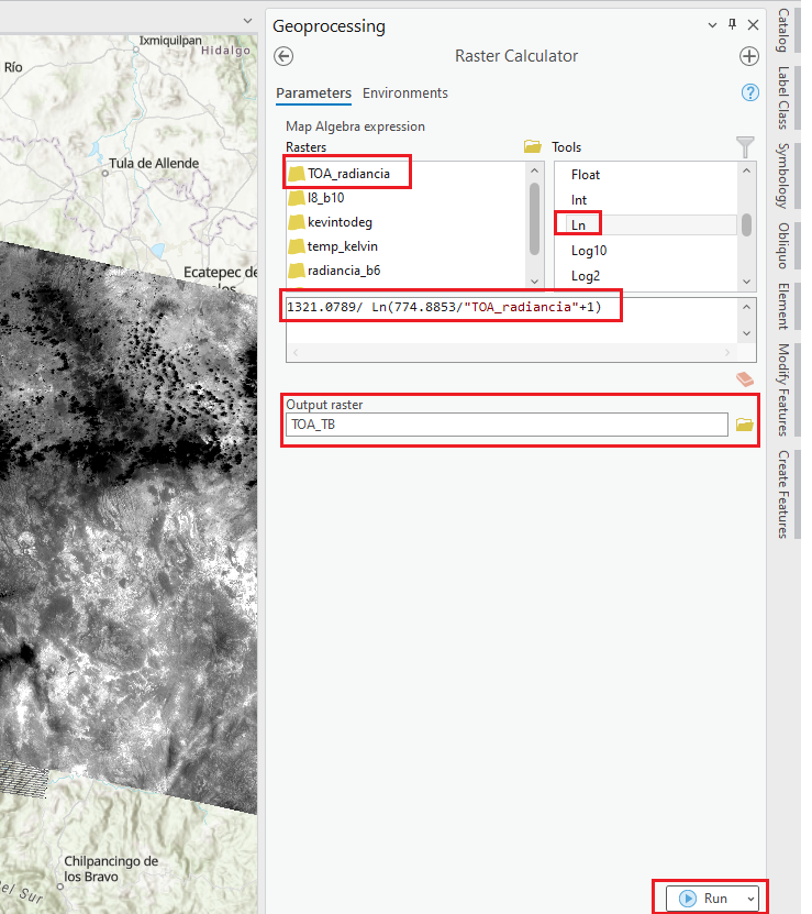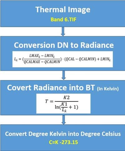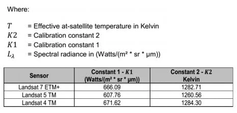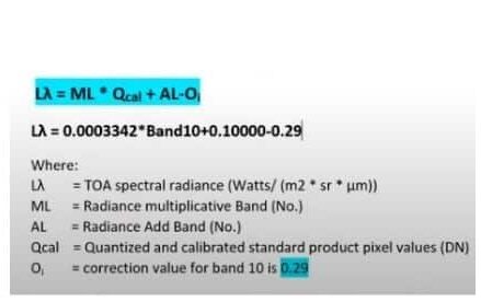 Para convertir la banda térmica de TOA Radiance a Temperatura de brillo, se hace como se muestra en la imagen a continuación:
