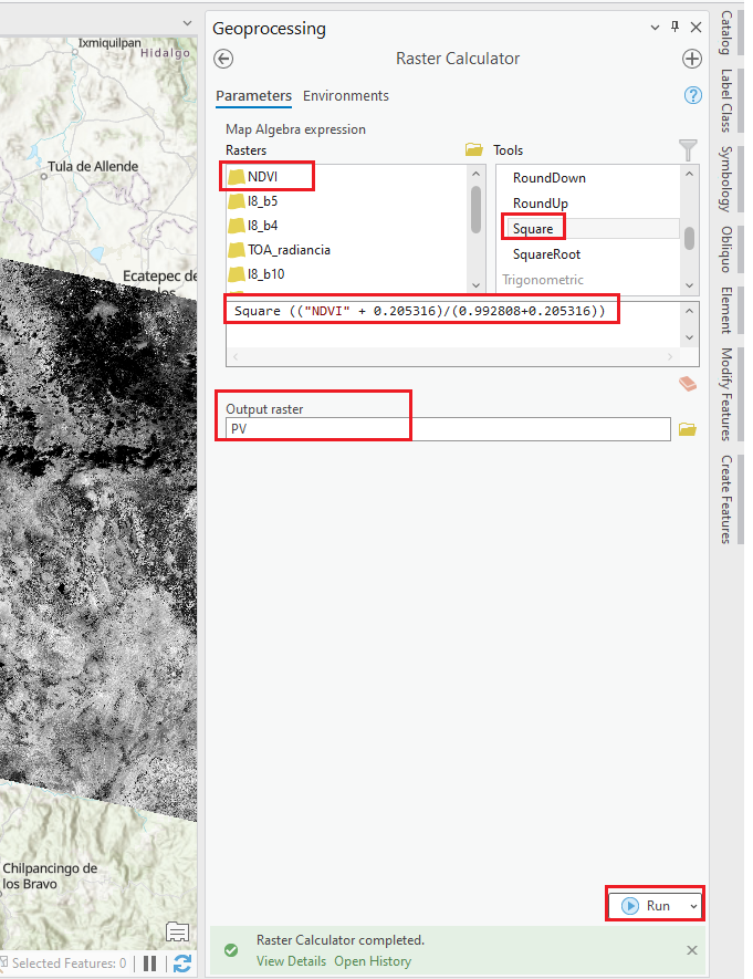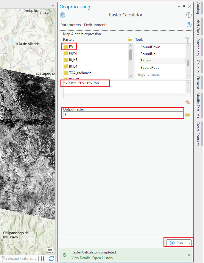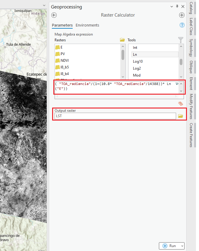 Por último, calcularemos usando la calculadora ráster en ArcGIS Pro para calcular la Emisividad de la Superficie Terrestre, esto se puede calcular a partir de LST, TB y NDVI.