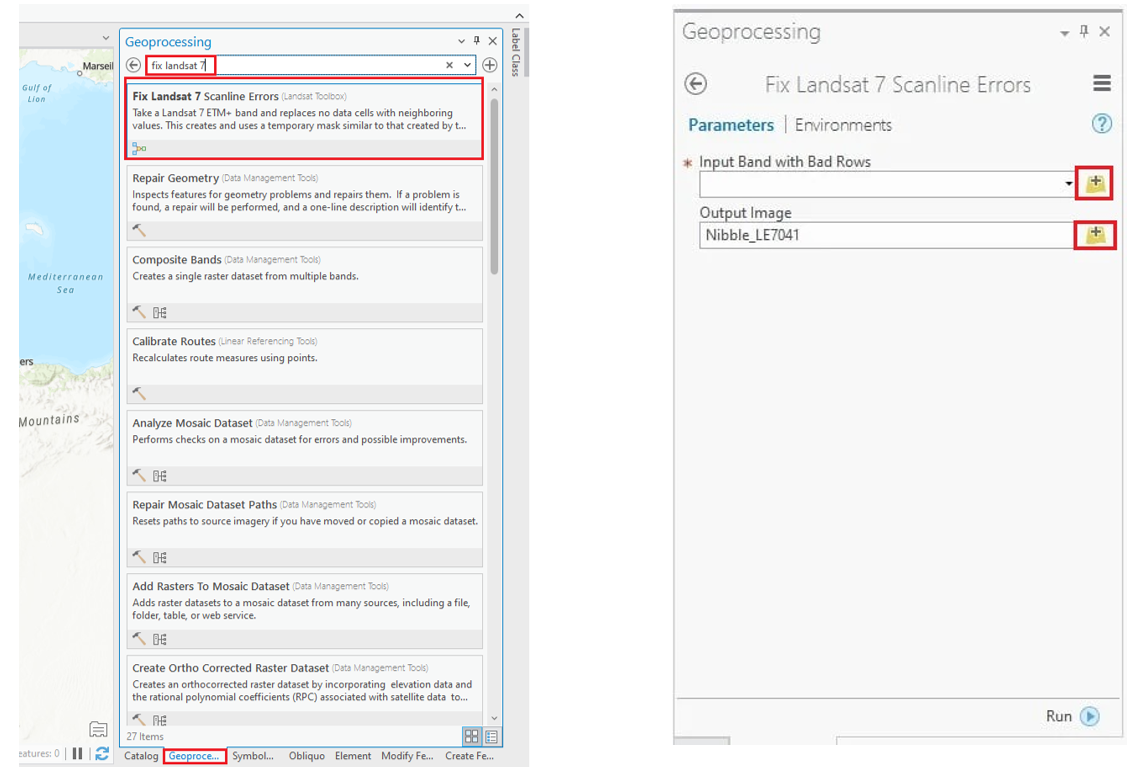 Hecho lo anterior, lo que a continuación haremos será reparar los errores de Scanline del Landsat para ello nos dirigimos al menú de Geoprocessing y ponemos en el buscador “Fix landsat 7…”, ingresamos a la herramienta y una vez ahí en la pestaña input Band with Bad Rows, ingresamos la banda 6 de Landsat 7 y en Output image seleccionamos el nombre y ubicación de salida del resultado.
