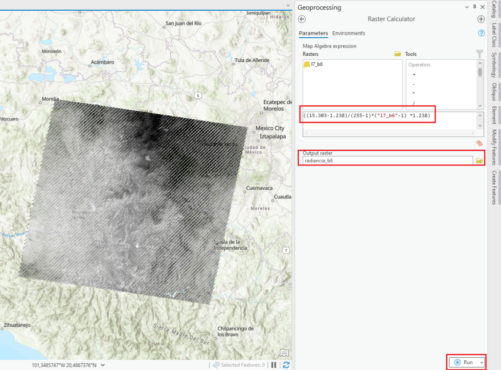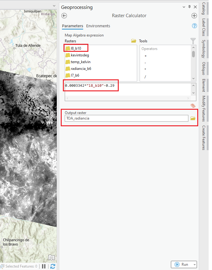 Una vez de haber obtenido los datos de la formulas anteriores, lo siguiente que haremos será convertir los valores de Números Digitales (DN) en radiancia en la parte superior de la atmósfera, esto lo haremos con la calculadora ráster, donde ingresaremos los datos como se muestra en la imagen a continuación: