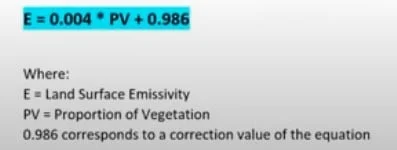 Para calcular la emisividad de la superficie terrestre (LSE) se debe ingresar la siguiente fórmula en la barra de cálculo de la calculadora ráster: