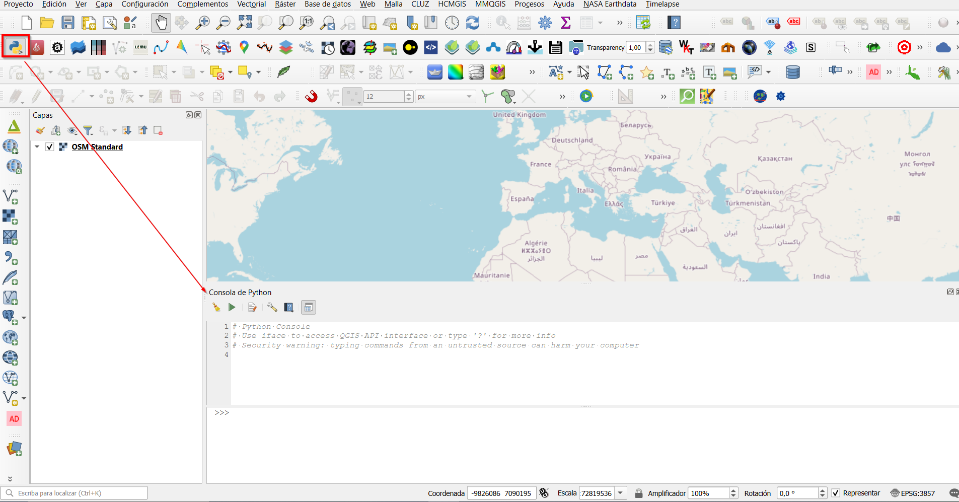 En esta entrada vamos a utilizar Python en QGIS para subir una entrada con unas pocas líneas de código desde una carpeta situada en nuestro ordenador. Vamos a trabajar con la última Versión LTR de QGIS estable. Para ello lanzamos la consola de Python para QGIS a través del siguiente icono: