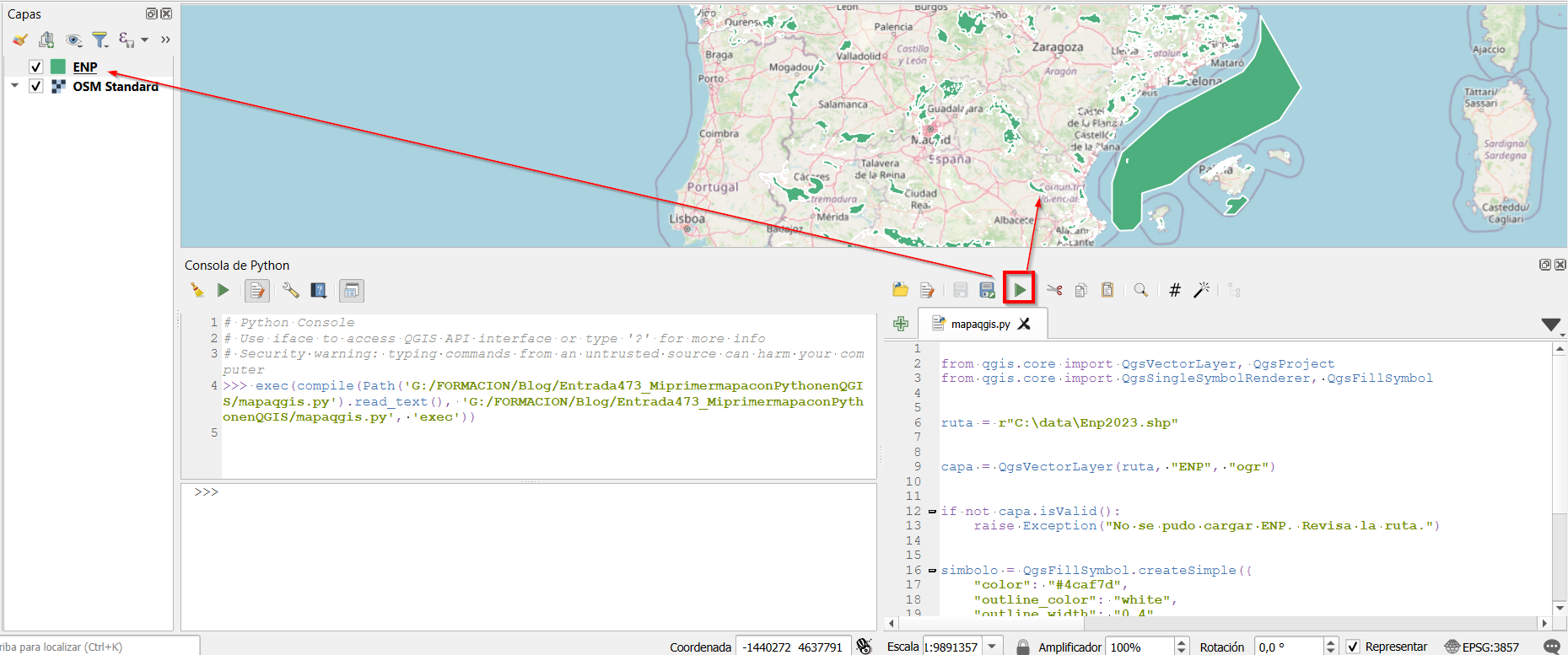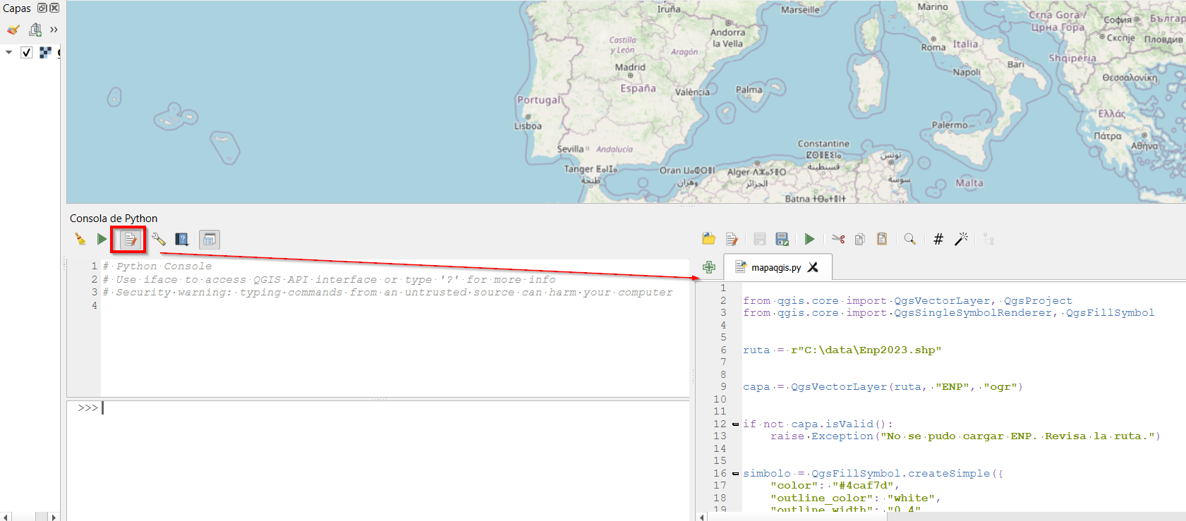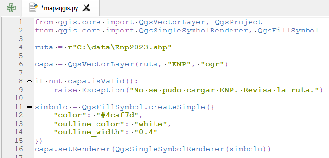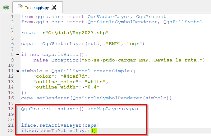 Y así se mostrará en nuestro visor de QGIS. Esto es una parte básica de todo proyecto Python en QGIS si queremos automatizar procesos.