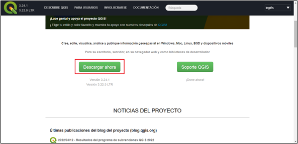 1. Entramos en la web de QGIS y hacemos clic en la opción de “Descargar ahora”.