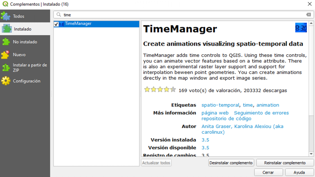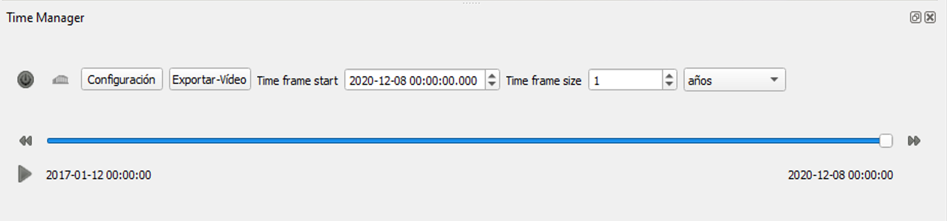 La última opción que permite realizar Time Manager es exportar el mapa animado con QGIS. Para ello, desde el panel de control de Time Manager haremos clic en exportar.