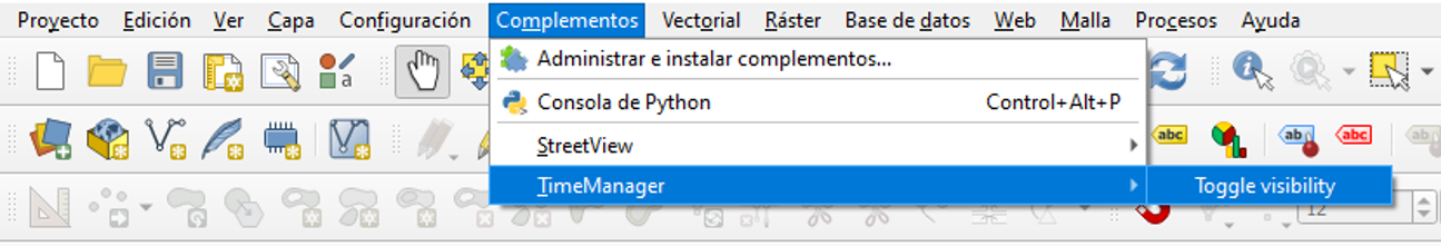 Una vez instalado en complemento Time Manager, se requiere una capa vectorial la cual debe contener además de la localización espacial de los datos, un atributo que cumpla como referencia a la fecha y hora del evento que representa el elemento. También es posible que Time Manager trabaje con capas ráster cargadas en QGIS que contengan componente temporal.