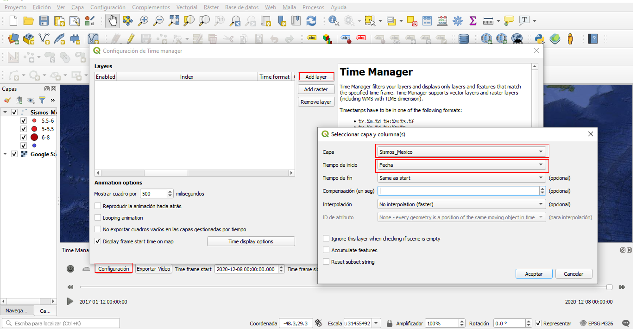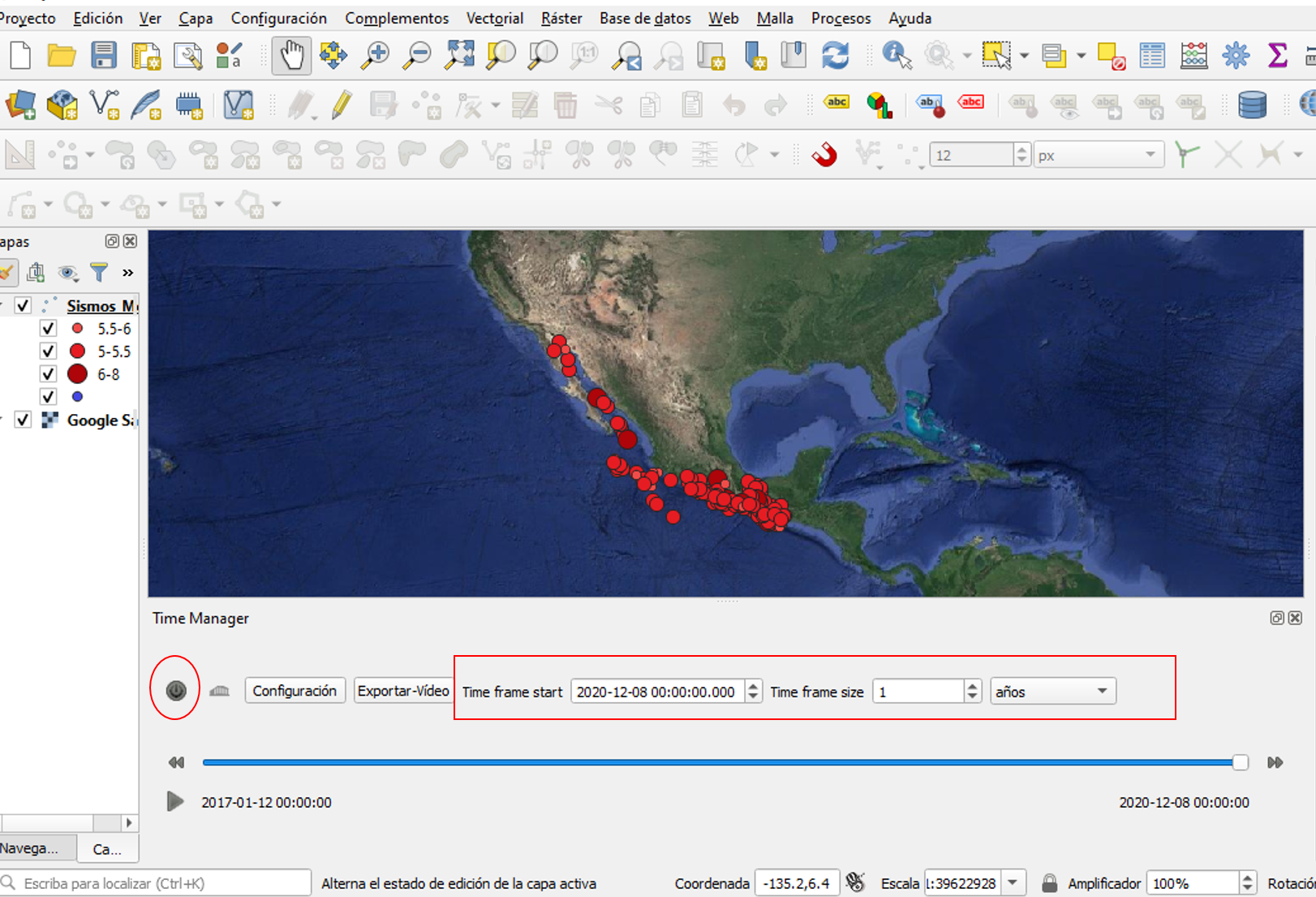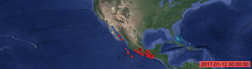 Si todo se ha configurado correctamente, podremos ver la evolución temporal de los Sismos en México desde 2017 hasta el 2020, apareciendo y desapareciendo los puntos que se corresponden con los eventos registrados.