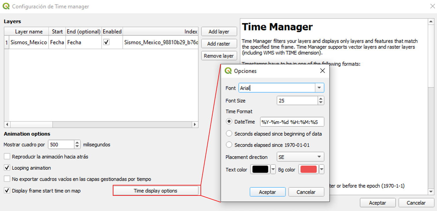 Desde el mismo cuadro de configuración podremos especificar los controles del contador de tiempo y otras opciones extras. Se debe activar la opción Display frame start time on map para que se muestre dicho cuadro de lienzo en el mapa y sea visible la animación.