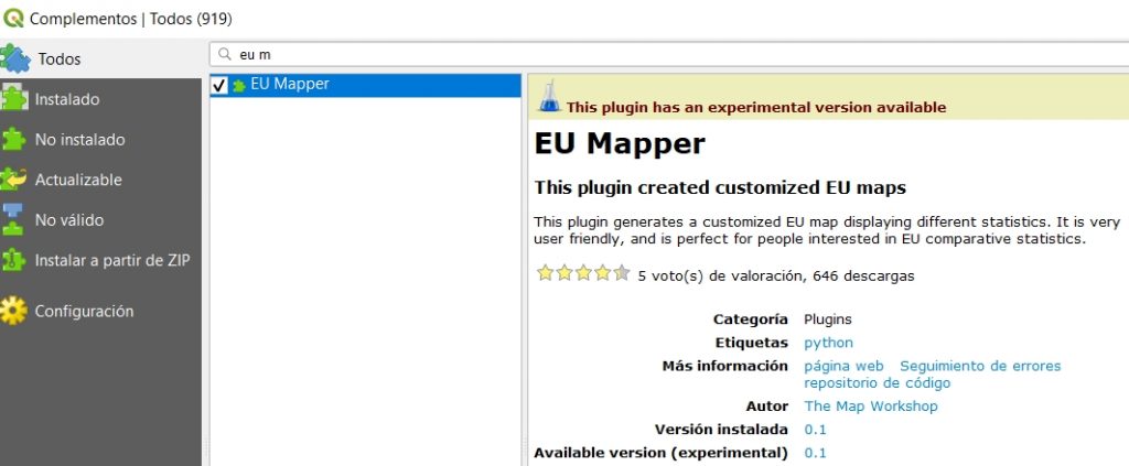 Si abrimos QGIS e indagamos en la pestaña “Complementos” podemos proceder a instalar “EU Mapper”:
