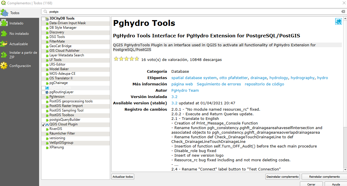 - Pghydro Tools: el complemento PgHydroTools es una interfaz utilizada en QGIS para activar todas las funciones de la extensión PgHydro para PostgreSQL/PostGIS.
