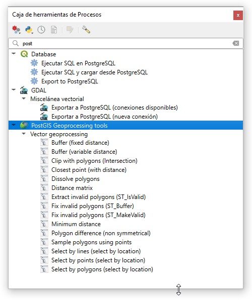 - PostGIS geoprocessing tools: Un conjunto de herramientas para realizar geoprocesamiento con capas de PostGIS. Las consultas SQL espaciales se ejecutan en el servidor de donde provienen las capas y el resultado será una capa PostGIS (creada directamente en el servidor de donde provienen las entradas) y no un archivo de forma como suele ocurrir en la caja de herramientas de Procesamiento. El complemento es experimental y en el futuro se beneficiará de una serie de mejoras que se realizarán en la caja de herramientas de procesamiento QGIS.