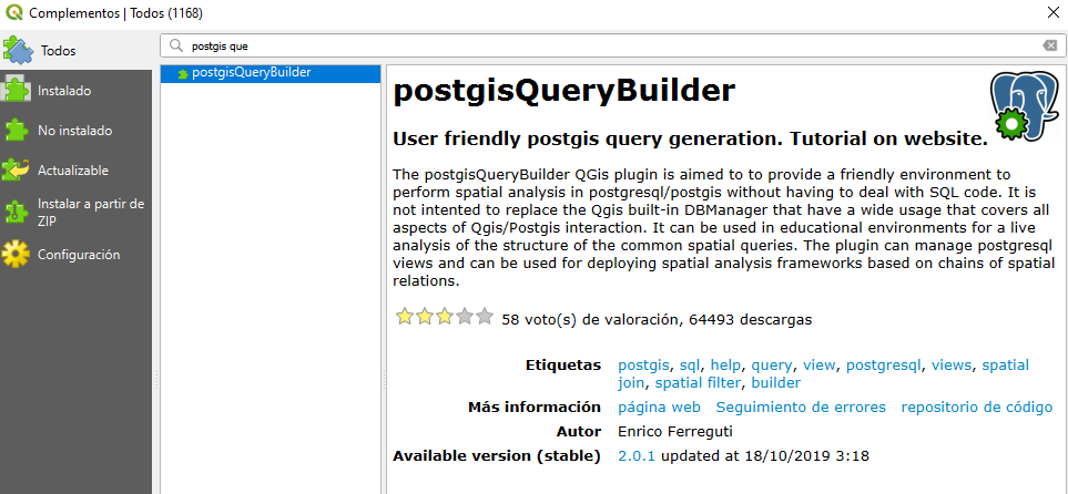 - postgisQueryBuilder: El complemento tiene como objetivo proporcionar un entorno amigable para realizar análisis espaciales en PostgreSQL/PostGIS sin tener que lidiar con código SQL. El complemento puede administrar vistas de PostgreSQL y puede usarse para implementar marcos de análisis espacial basados en cadenas de relaciones espaciales.