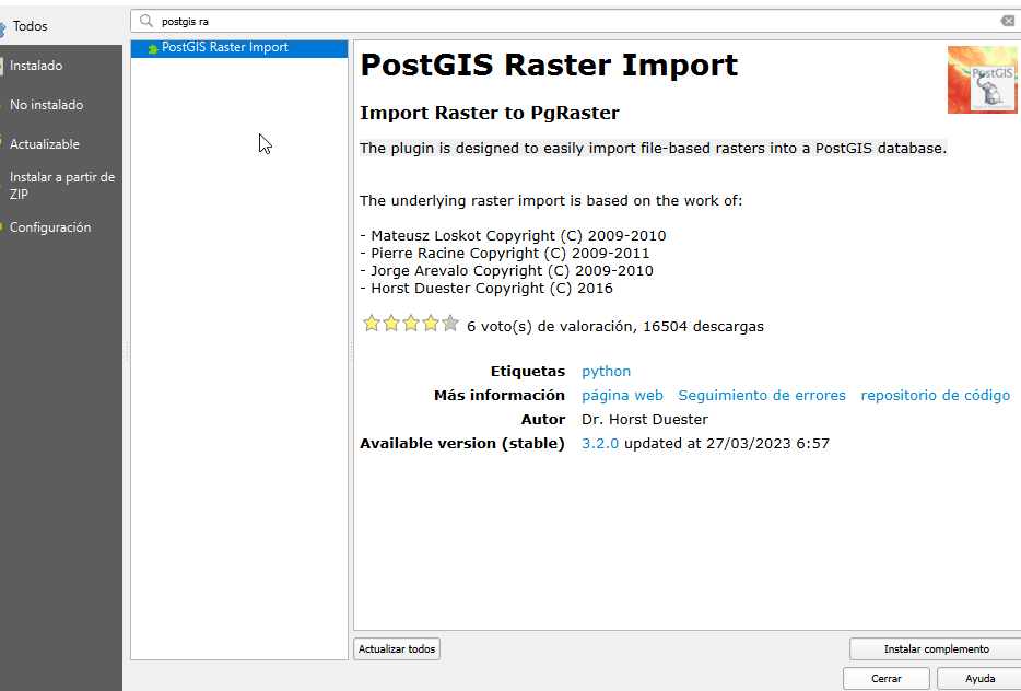 - PostGIS Raster Import: el complemento está diseñado para importar fácilmente archivos con formato tipo ráster a nuestra database en PostGIS.