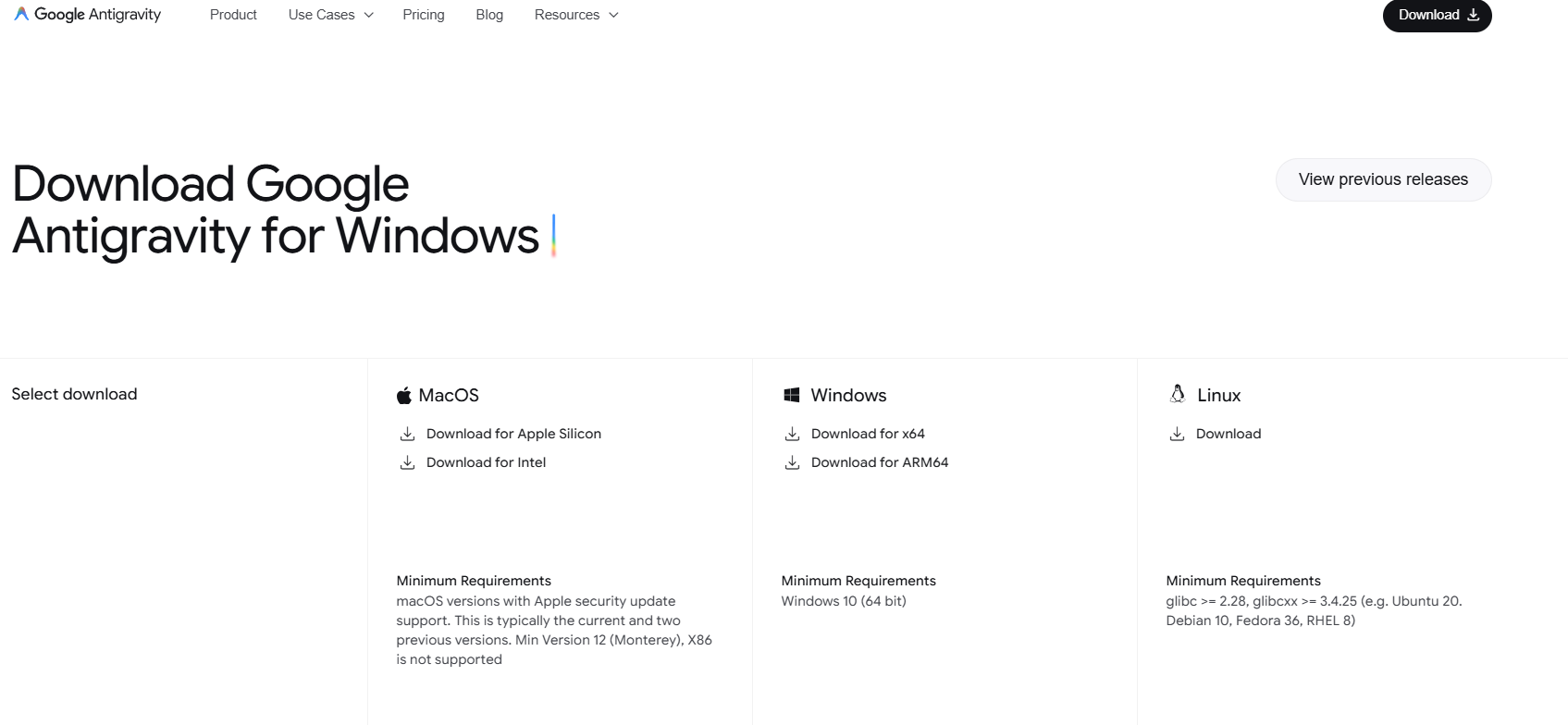 En esta ocasión se va a mostrar como instalar la IDE “Google Antigravity”. Esta IDE lleva integrada Inteligencia Artificial la cual te facilita la labor a la hora de desarrollar tus proyectos, veremos un ejemplo. Antes que nada, iremos a la página web del programa para proceder a la descarga. Lo puedes llevar a cabo en Windows, MacOS e incluso Linux.