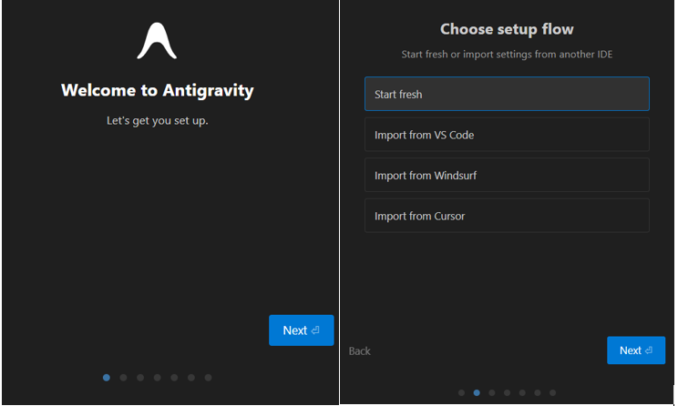 Una vez instalado te aparecerá la siguiente ventana podrás elegir entre empezar de cero, o importar tus proyectos desde las IDEs más importantes actuales como Windsurf, VS Code o Cursor ( que ya hemos visto en anteriores entradas) para seguir trabajando con tu código: