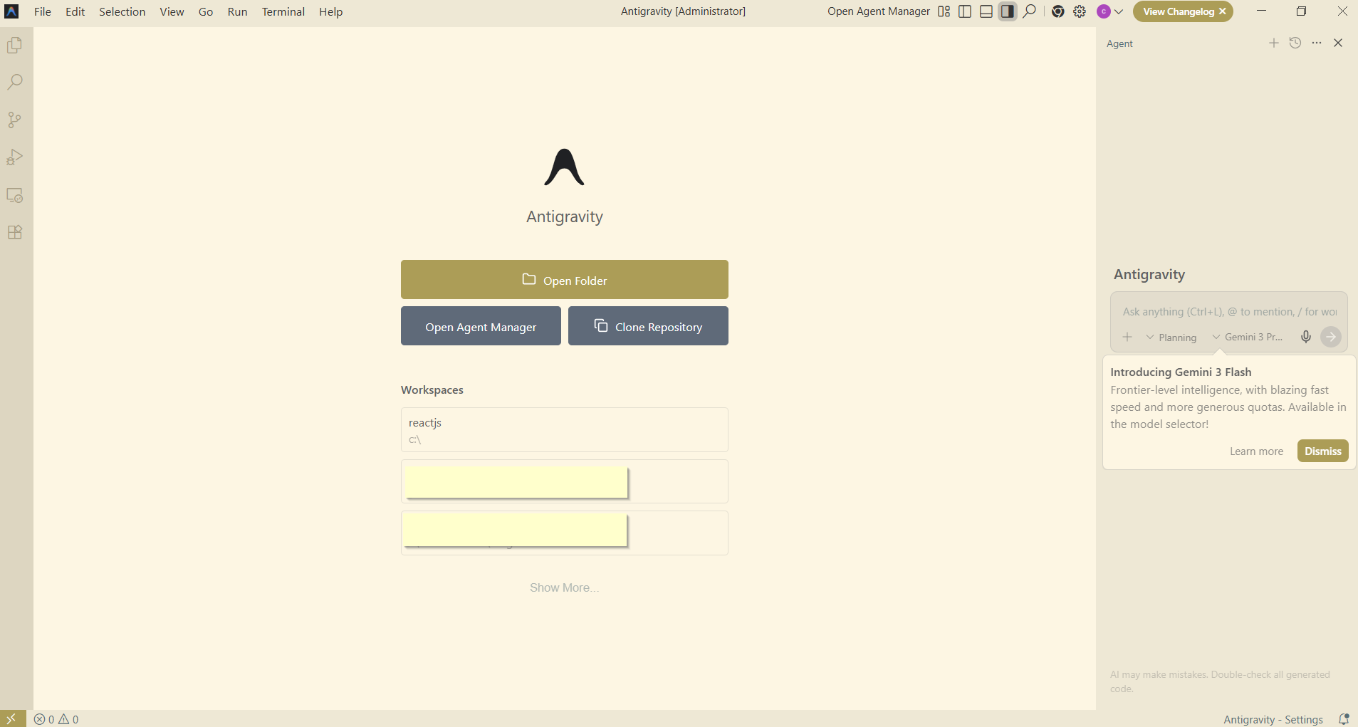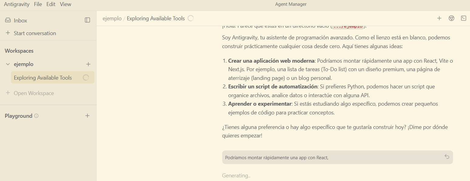 En la siguiente ventana ya se abrirá la interfaz de la  IDE y podrás realizar diferentes acciones como clonar un repositorio, abrir carpeta, o lanzar “Open Agent Manager”. Lo abrimos, (damos a “Next”) y le podremos preguntar cualquier duda respecto a nuestro proyecto o que directamente lleve a cabo una acción que nos interesa.