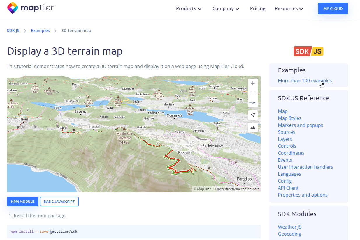 O apoyarte en el SDK de Maptiler para desplegar tus propios visores ya que posee numerosos ejemplos de desarrollo y complementándolo también existen otros módulos SDK como “Weather JS” y “Geocoding”: