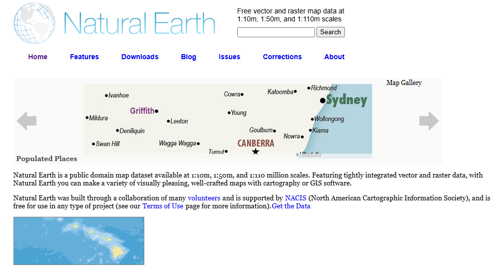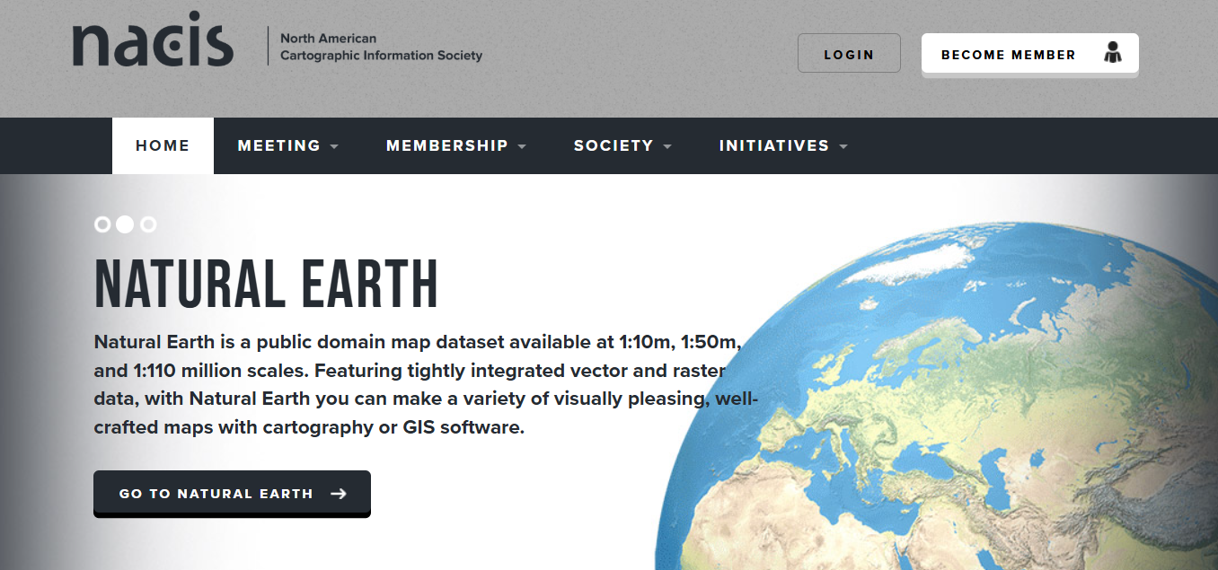 1. Natural Earth: seguro que ya conoces esta fuente de datos si trabajas o te gusta crear mapas, NE fue un proyecto originalmente apoyado por NACIS en su lanzamiento. Sigue difundiendo en su web dicha fuente de datos y siendo patrocinador.