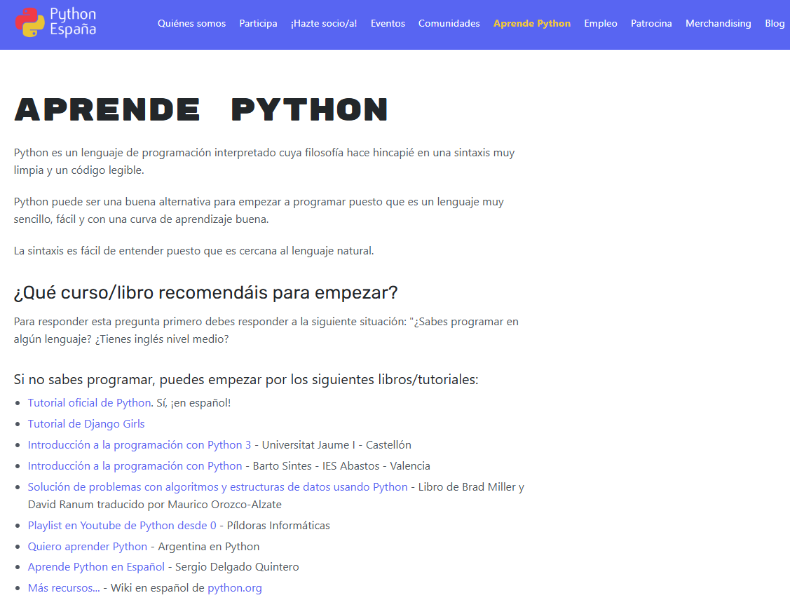 Los alumnos me preguntan mucho sobre recursos de Python para seguir aumentando sus conocimientos en este lenguaje de programación. Uno de las grandes ventajas de aprender Python es la gran cantidad de desarrolladores y páginas web relacionados con esto, que podemos encontrarnos en la web. Voy a dejar un listado de los que considero interesantes, pero, por supuesto, me dejo muchos en el “tintero”, es sólo un acercamiento a este campo.