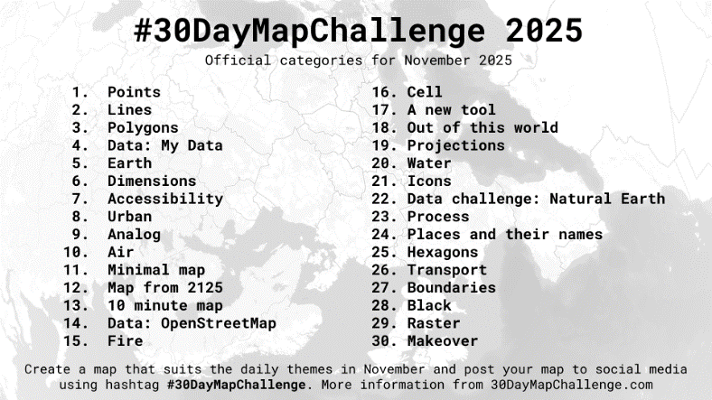 Un año más se celebra el desafío #30DayMapChallenge en el que diferentes usuarios crean diferentes mapas cada día según el listado temático que se proyecta para cada día de noviembre. Estas creaciones podemos encontrarlas en diferentes redes sociales, yo me centraré en las que aparecen en Bluesky.
