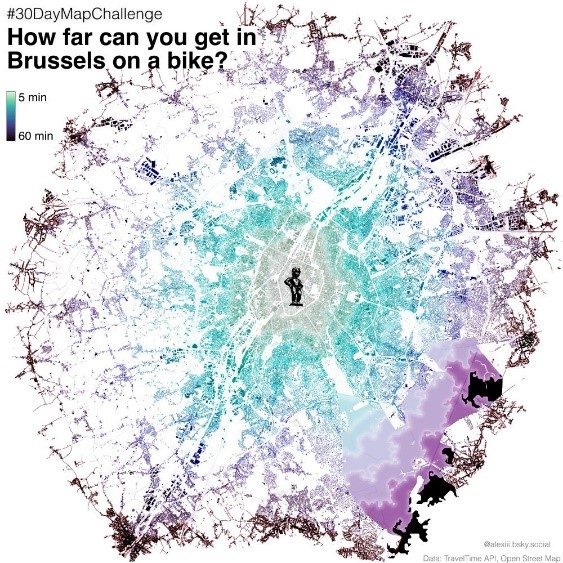 3. El siguiente ejemplo de @alexiii.bsky.social dedicado a la temática del día 7 sobre la accesibilidad nombrado «¿Hasta dónde se puede llegar en Bruselas en una hora?»