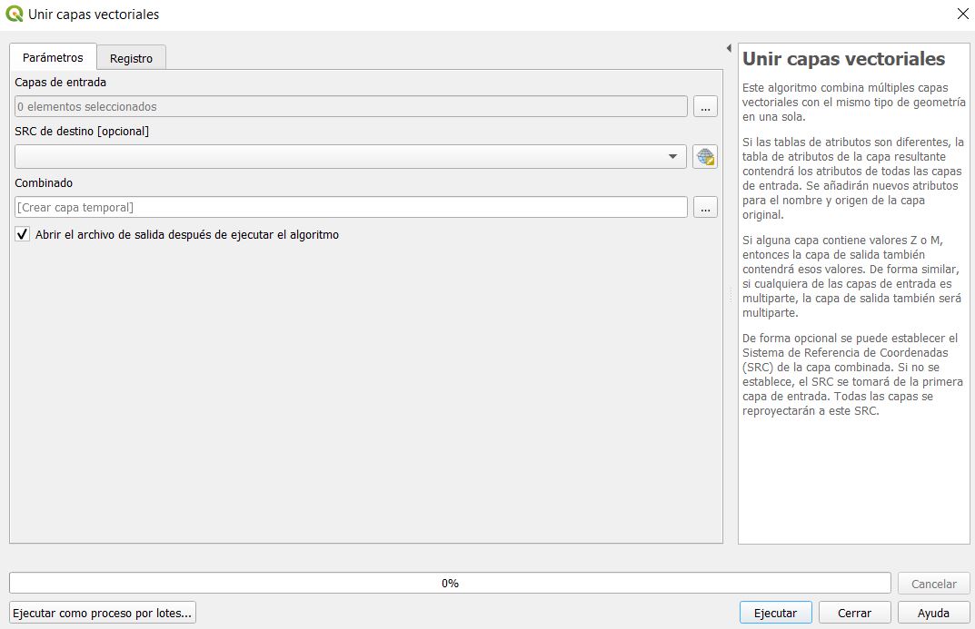 Si se abren las capas en QGIS se verá que están marcadas por polígonos, por lo que la primera acción dará utilizar la herramienta “Dissolve” para cada una de las capas: