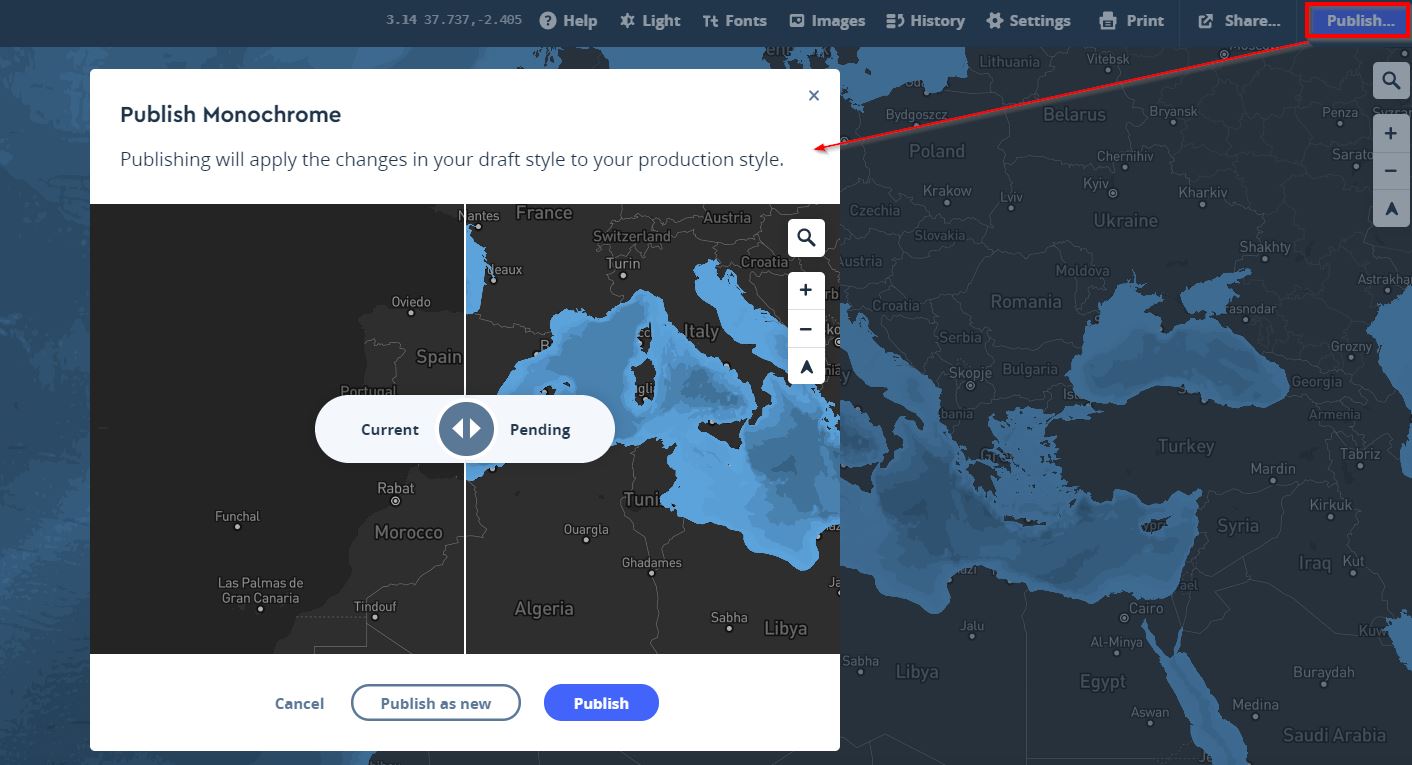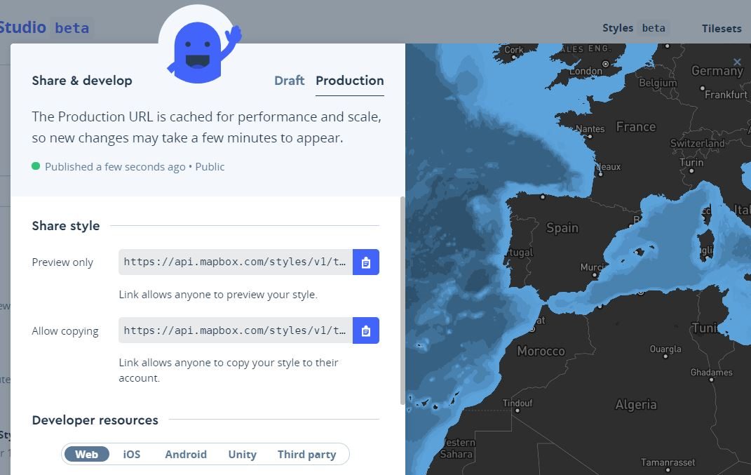Entonces te diriges a la pestaña “Styles” , creas uno nuevo y se te abre una plataforma de trabajo añades la nueva capa (puedes incluir también un mapa base de tu interés). Una vez obtenido un visor que te interese, puedes publicarlo: